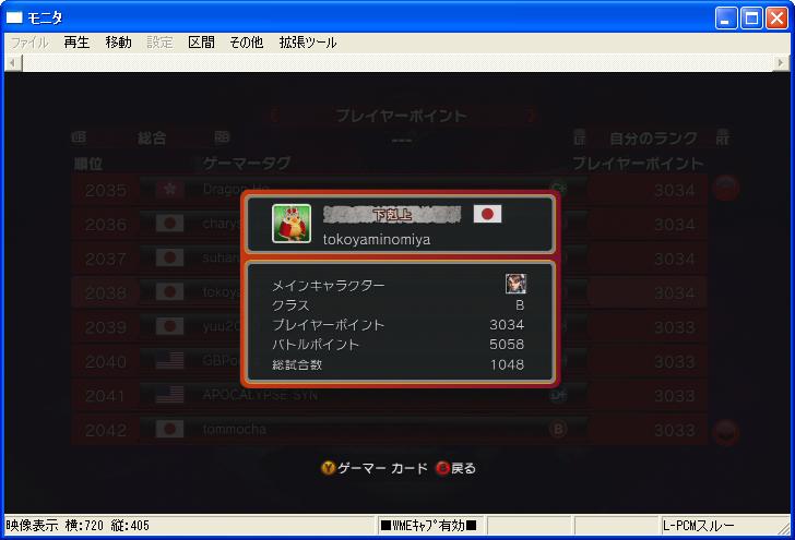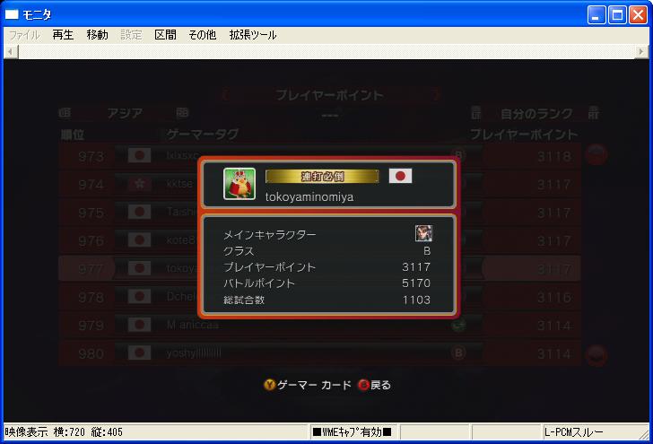 × [PR]上記の広告は3ヶ月以上新規記事投稿のないブログに表示されています。新しい記事を書く事で広告が消えます。 PP50上がって3100ちょいに。 しかし一時は連勝してPP3400近くまで行った。 BP12000の春麗にも勝てたり。 どうも春麗戦は楽に感じるなぁ。 勝率も10番目ぐらいに良いし。 自分で使ってある程度分かってるからかな。 今明らかにきついのがブランカ、DJ、ゴウケンあたり。 こいつらの勝率が30%台・・・。 ブランカはもうしょうがないとして。 DJとゴウケンは下がられて弾連打されて近づいた所で追い返されての繰り返しで死ぬ。 ホウセンカ選んだ方がいいのかなぁ。 似たような事されるガイルには何故か勝率結構良いんだけどねぇ。 バイソンは全然行けるようになってきた。 まだ勝率30%台だけど、いずれ勝ち越しまで行くんじゃないかな。 今勝率最低なのはサガットで14%w 酷過ぎるw スト4だったらどうなるんだこれw PR PP3030→2500→3060 一瞬だけPP3100行ったんだけど負けてすぐおしまい。 それじゃマリコレTA見ます。